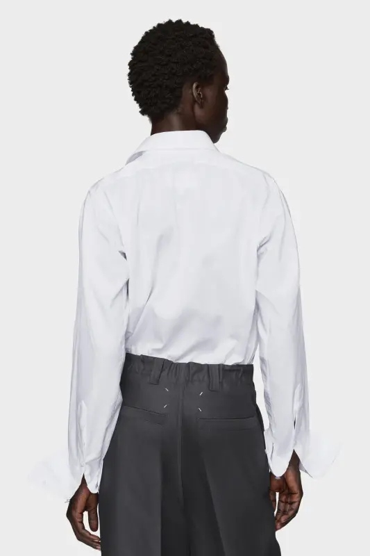This cotton shirt plays with proportion, cutting a clean silhouette from classic elements: sharp collar, oversized cuffs, and a curved hem. Familiar components, restructured. At the back, the Maison’s signature four stitches appear; the opposite of a label.