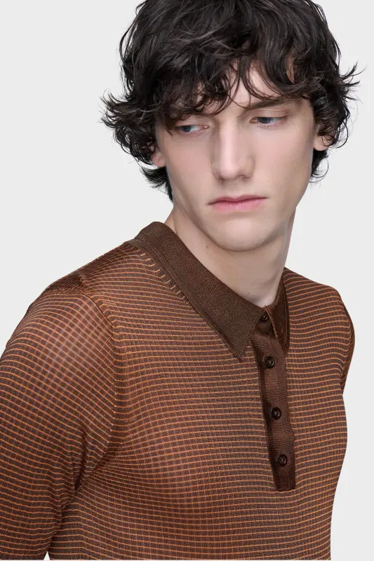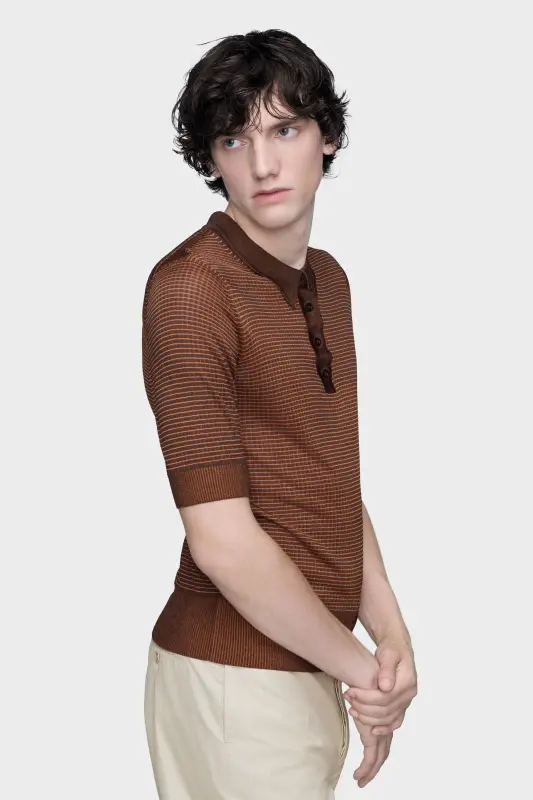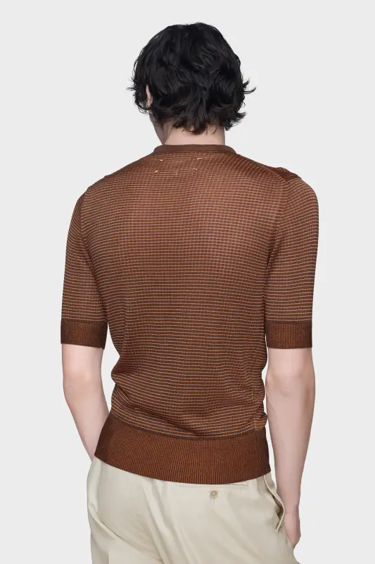 This striped knit polo is crafted in fine wool in a dandy check, offering a slim silhouette with ribbed trims that frame the collar, sleeves, and hem. A button placket sharpens the design. At the back, the Maison’s signature four stitches appear; the opposite of a label.