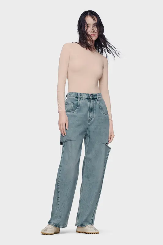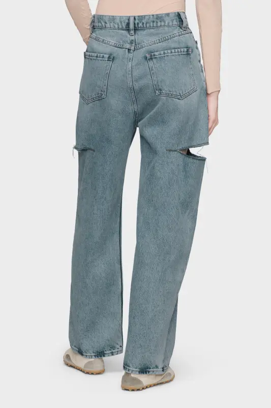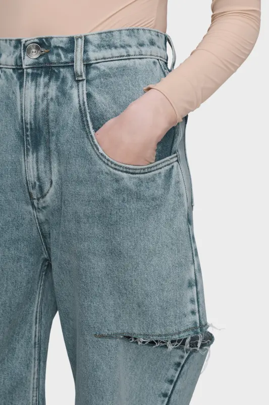 Loose-fitting denim jeans in stonewashed hue. The jeans are tight at the waist and voluminous on the straight legs, which are left rough-cut to reveal fraying fabric at the slashes on the thighs. The jeans are crafted from cotton and have five pockets with a contrast camel topstitch.