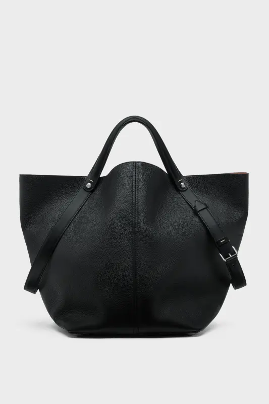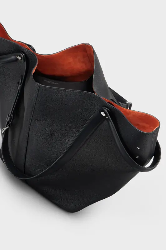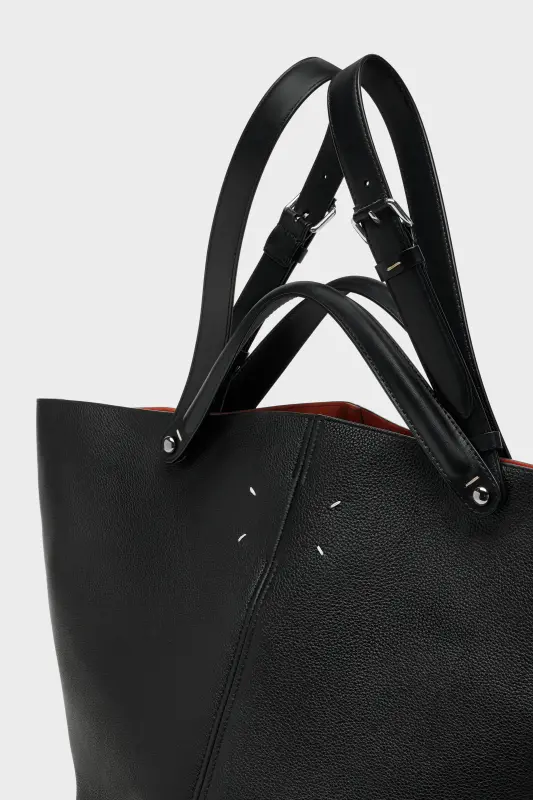 The Maison launches the Dress-age handbag for SS25, crafted from soft pebbled calfskin. With an equestrian spin, the large handbag features classic leatherwork and refined lines, combining unconscious glamour with gestural design. It follows a trapezoid shape with contrast dual-wear strap detail. The studded base allows the bag to stand, and the inner is adorned with the logo. Maison Margiela's signature, the four stitches, appear at the back; the opposite of a label.