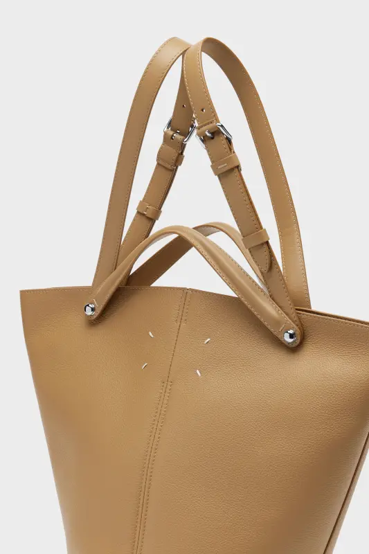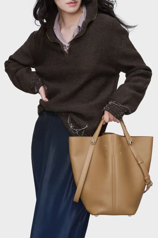 The Maison launches the Dress-age handbag for SS25, crafted from soft pebbled calfskin. With an equestrian spin, the medium handbag features classic leatherwork and refined lines, combining unconscious glamour with gestural design. It follows a trapezoid shape with contrast dual-wear strap detail. The studded base allows the bag to stand, and the inner is adorned with the logo. Maison Margiela's signature, the four stitches, appear at the back; the opposite of a label.