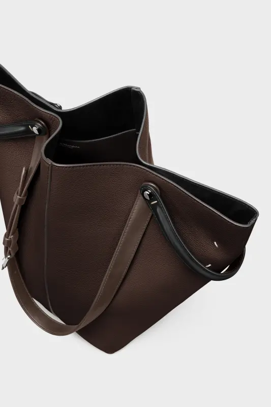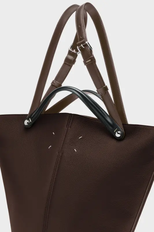 The Maison launches the Dress-age handbag for SS25, crafted from soft pebbled calfskin. With an equestrian spin, the medium handbag features classic leatherwork and refined lines, combining unconscious glamour with gestural design. It follows a trapezoid shape with contrast dual-wear strap detail. The studded base allows the bag to stand, and the inner is adorned with the logo. Maison Margiela's signature, the four stitches, appear at the back; the opposite of a label.
