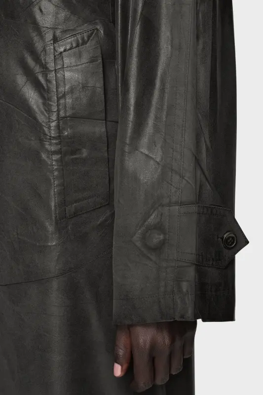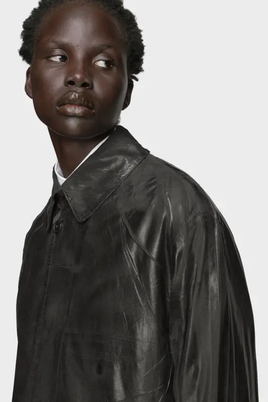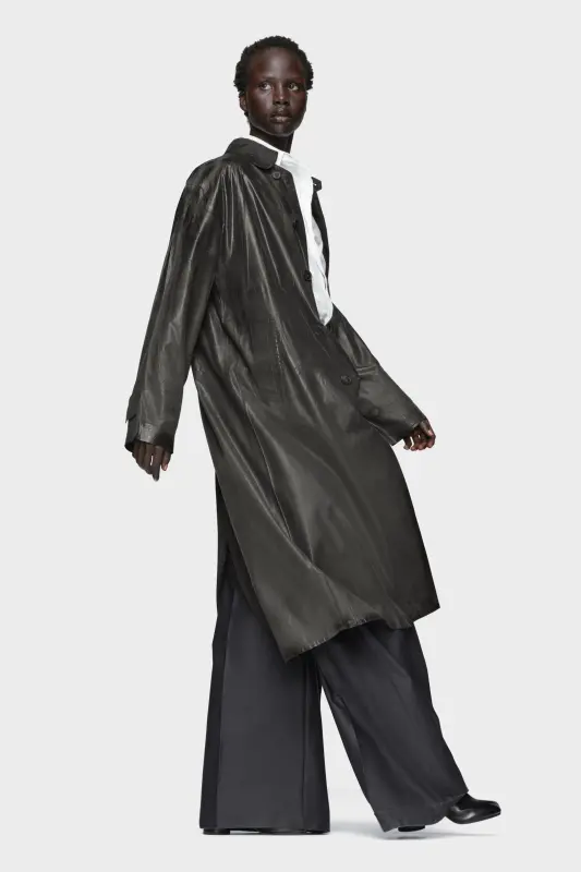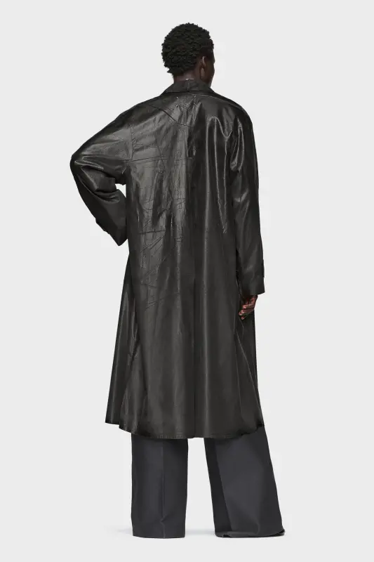 Maison Margiela reimagines the trench coat through a distinctive foil-printed surface. Created using a layered process of airbrushed pigment and applied foil, then pressed to intensify contrast, each coat is uniquely finished by hand. The result is a glossy, broken texture that shifts with movement. At the back, the Maison’s signature four stitches appear; the opposite of a label.