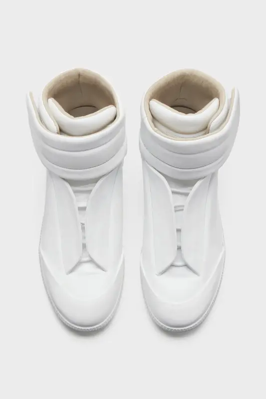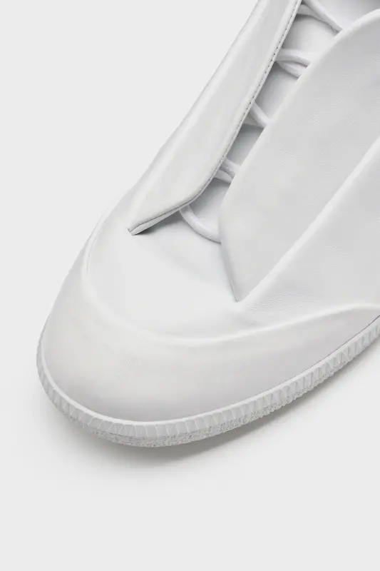 Originally launched in the SS11 collection, the Future sneaker is reintroduced this season. Defined by its seamless construction and concealed fastening. Built without visible laces, a hidden strap folds across the tongue to create a uniform surface, evoking anonymity and restraint. Crafted in soft calfskin, the mid-top silhouette is finished with a tonal sole. Maison Margiela's signature single white stitch appears at the back.