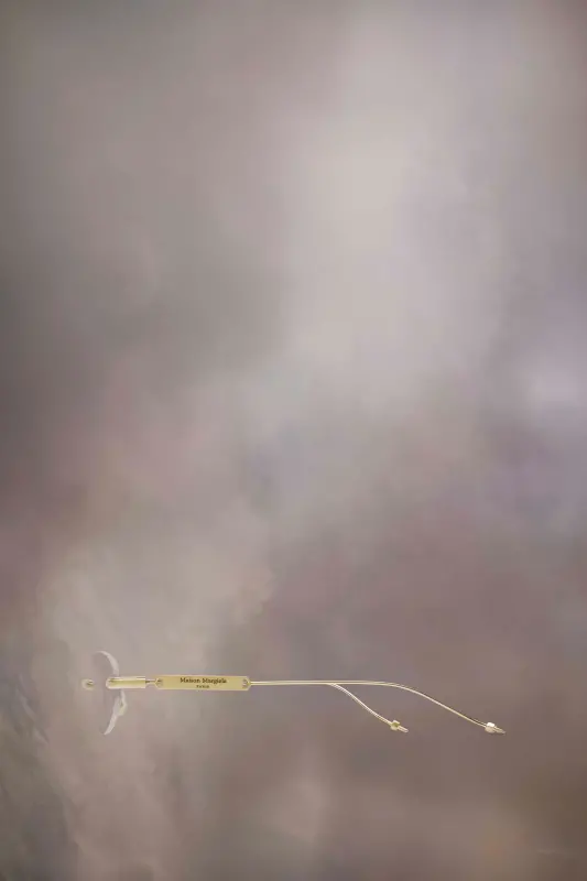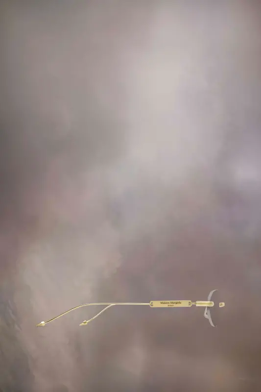 Crafted in titanium, the Maison Margiela x Gentle Monster MM217 A030 glasses feature a frameless clear lens and oval shape, with matte finish hardware details inspired by the Maison Margiela Bolt & Nut accessories collection. Metal plates appear at the temple, engraved with the Maison Margiela logo.