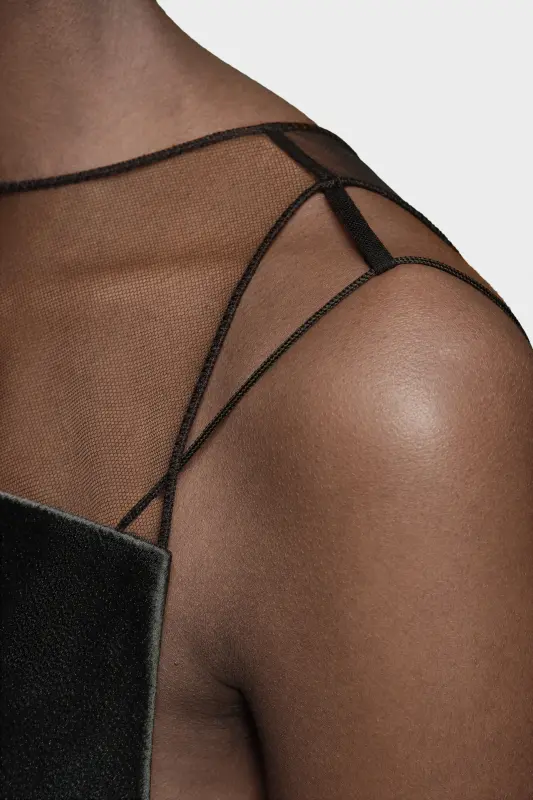 In hammered satin, this maxi dress which pools on the floor, follows a sleeveless design with a boat neck. Sheer panelling features at the chest and around the back, with a large cut-out. It's finished with four white stitches showing the hand of the Maison: the opposite of a label.