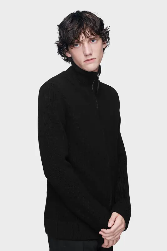 The jersey knit cardigan has long sleeves and zip-up design. It comes in a ribbed finish. Gauge 7.