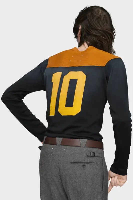 A play on vintage athleticwear, this long-sleeved jersey is designed with textured contrast panels at the collar and shoulders, with a bold varsity-style appliqué across the chest. Treated using the Maison’s Sun Faded technique, the fabric is softened to evoke the nostalgic patina of timeworn materials. Maison Margiela’s signature, the four stitches, appear at the back; the opposite of a label.