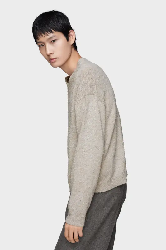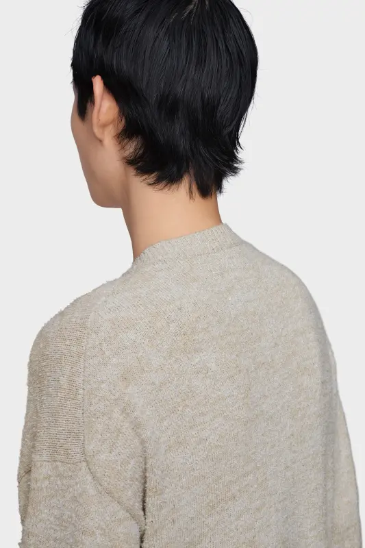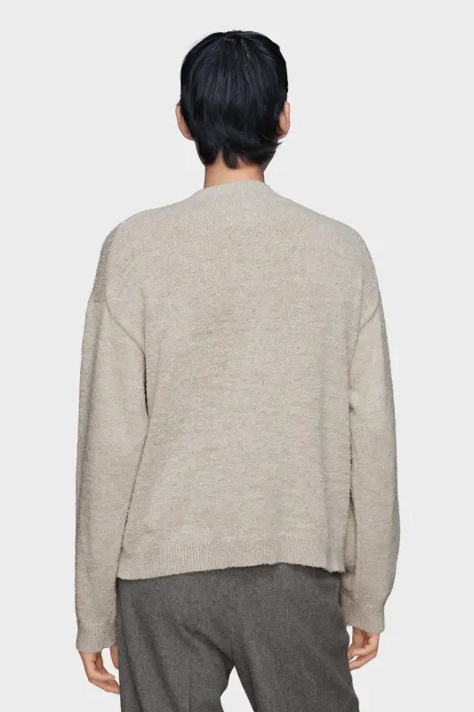 This V-neck sweater embodies the Maison’s understated approach to heritage knitwear. Flecked yarn and dropped shoulders introduce texture and softness, while the surface is deliberately pilled to evoke a lived-in look. Maison Margiela’s signature, the four stitches, appear at the back; the opposite of a label.