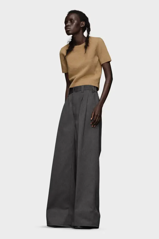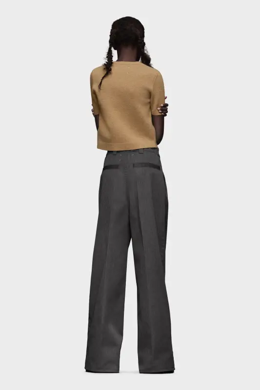In a wool cotton blend, the trousers feature front pleats, high-waist and wide-leg. They have a Margiela hook closure and belt loops. Maison Margiela's signature, the Four stitches, appear at the back; the opposite of a label.