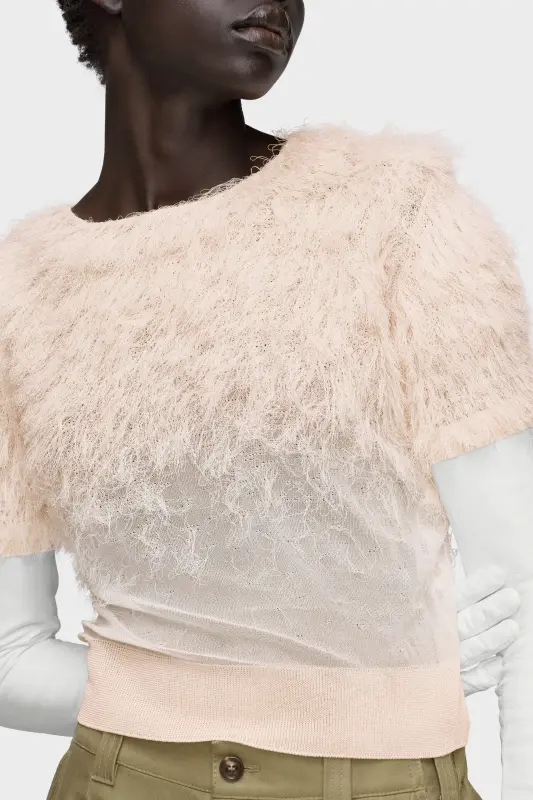 This short-sleeved top is crafted in silk knit with a textured finish that fades through the body – an expression of the Maison’s retrograding technique. The ribbed waistband and round neck create a neat contrast to the airy surface. At the back, the Maison’s signature four stitches appear; the opposite of a label.