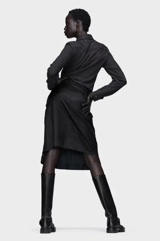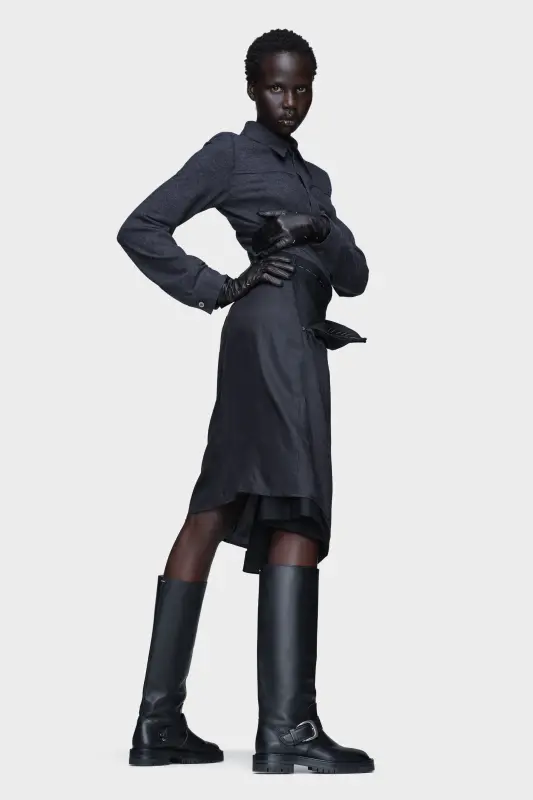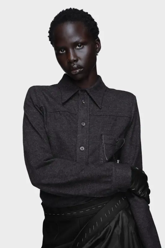 This dress embodies Maison Margiela’s philosophy of transformation, ritual, and reverse construction. A wool shirt top meets a draped skirt with the lining worn outward, reversing conventional layers. Washed textures create visual dialogue while a side zip opens to release a front drape, echoing the act of dressing. Work-in-progress stitching at the chest pocket and visible basting threads reflect the Maison’s use of Décortiqué elements to reveal the garment’s inner story. Maison Margiela’s signature, the four stitches, appear at the back; the opposite of a label.