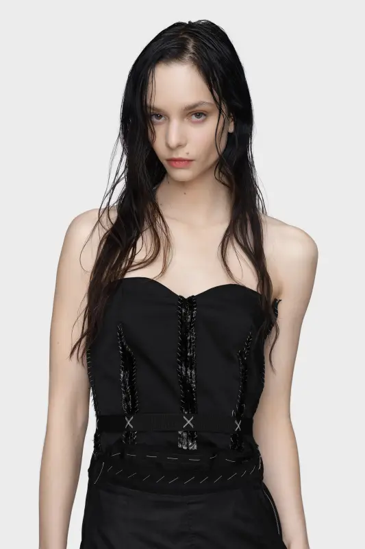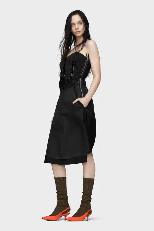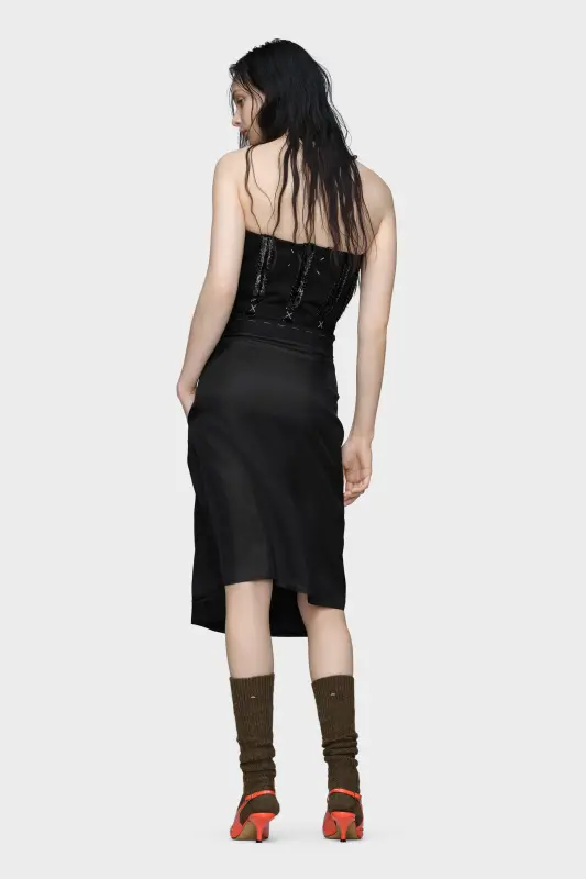 This strapless dress explores structure through contrast: a sculpted bodice, detailed with exposed boning and stitched embellishments, is anchored by a deconstructed skirt. The front zip allows for versatile styling, while the Maison's Anonymity of the Lining subtly showcases the garment’s internal architecture. Maison Margiela’s signature, the four stitches, appear at the back; the opposite of a label.