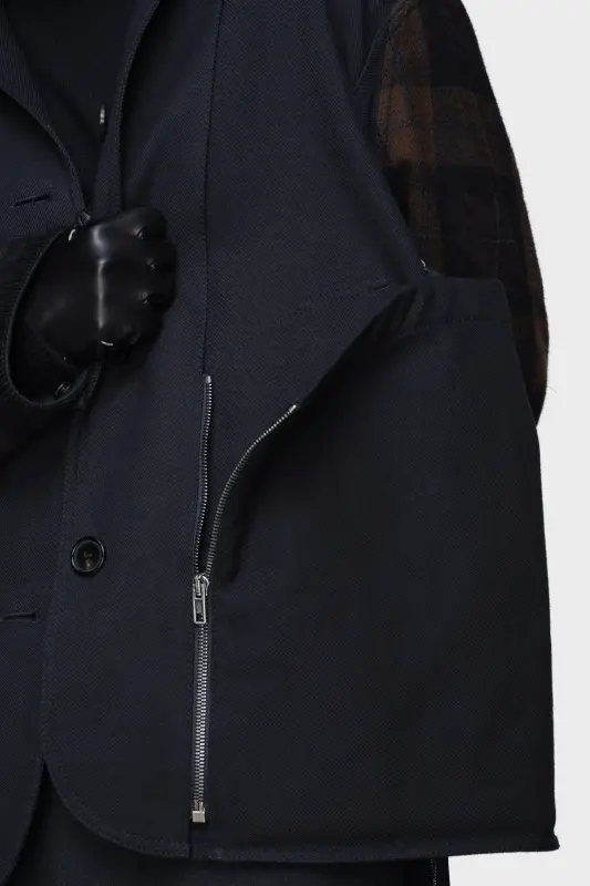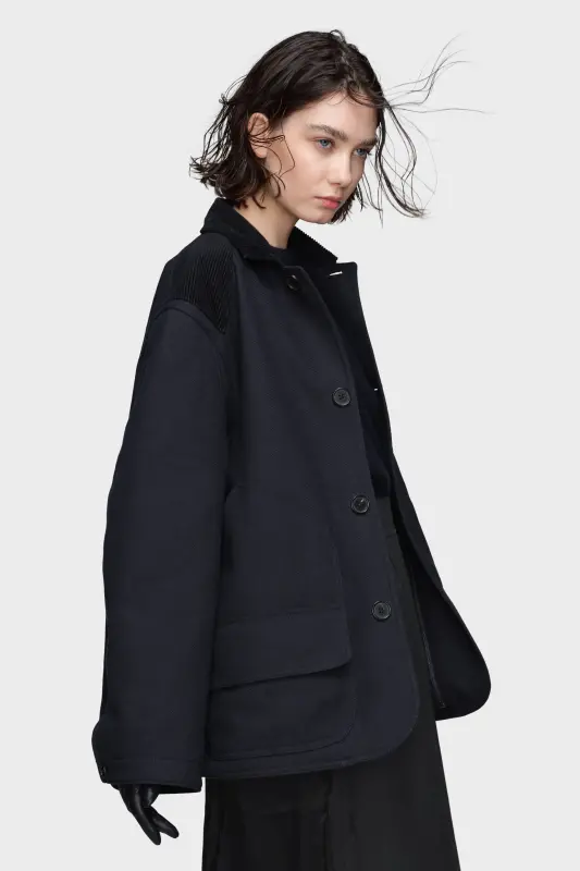 This reversible coat can be worn four ways: with either side facing out, or extended into a coat using the concealed zip beneath the hem. Contrast corduroy at the shoulders and collar brings added texture. Maison Margiela’s signature, the four stitches, appear at the back; the opposite of a label.