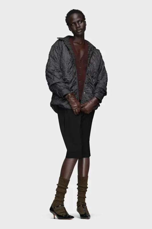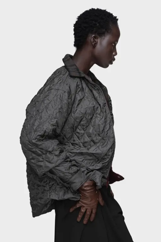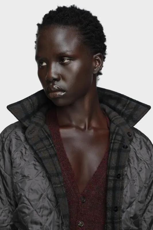 This reversible padded shirt-jacket is constructed with quilted panels that ripple across the surface. The checked wool collar evokes rural archetypes, while the padded volume offers both warmth and shape. Maison Margiela’s signature, the four stitches, appear at the back; the opposite of a label.