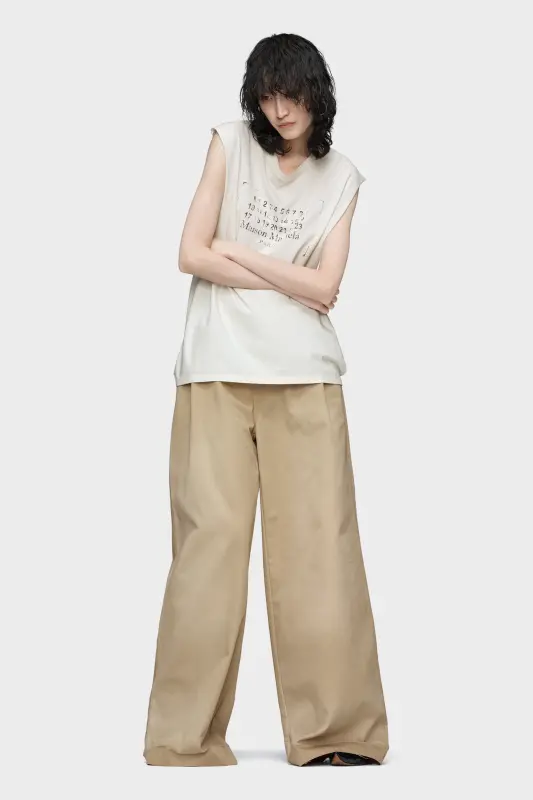 Minimalist in construction and cut for easy layering, this sleeveless top is finished with raw edges and a faded take on the Maison’s numeric logo. Maison Margiela’s signature, the four stitches, appear at the back; the opposite of a label.