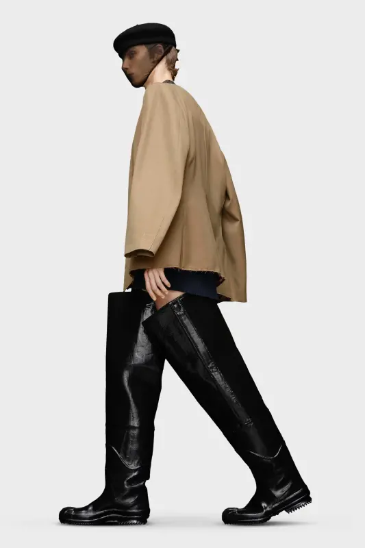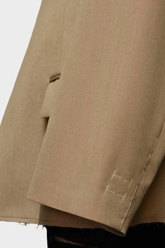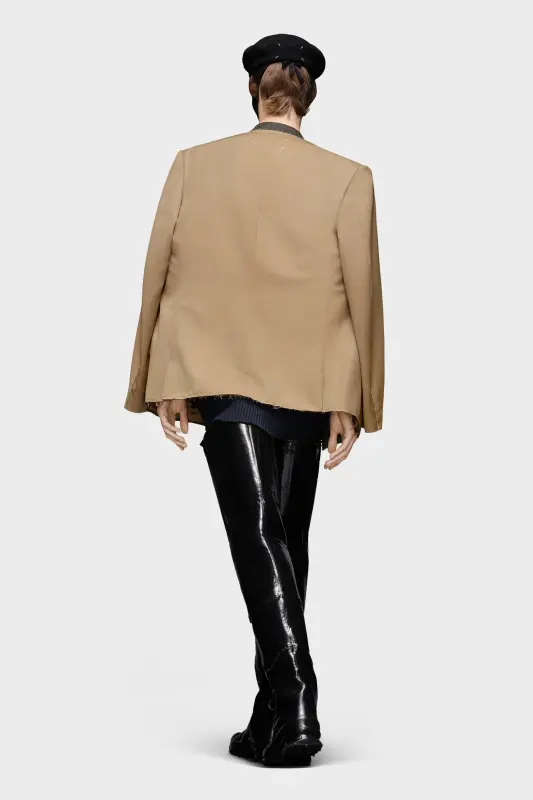 A blazer in wool with a mandarin collar and asymmetric pockets. It features a contrast collar, the memory of cuffs and four white stitches at the back showing the hand of the Maison: the opposite of a label.