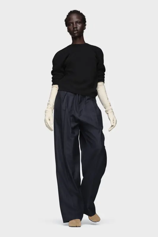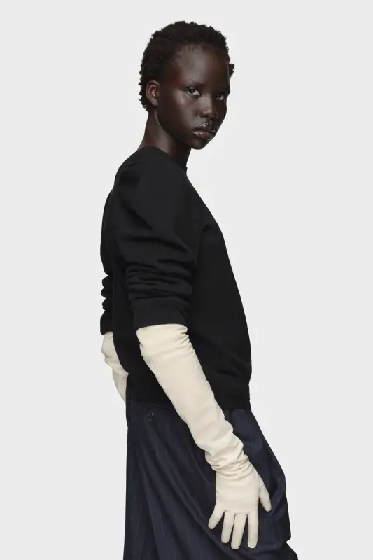Maison Margiela transforms a familiar silhouette through its gestural cutting technique, capturing the unconscious act of getting dressed. The raised shoulder seams on this wool jumper trace that fleeting moment – refined, expressive, and unforced. At the back, the Maison’s signature four stitches appear; the opposite of a label.