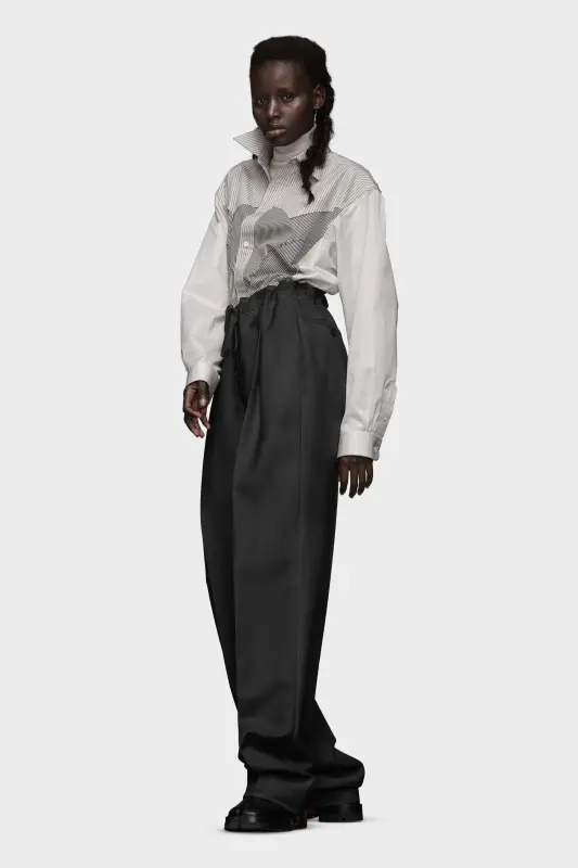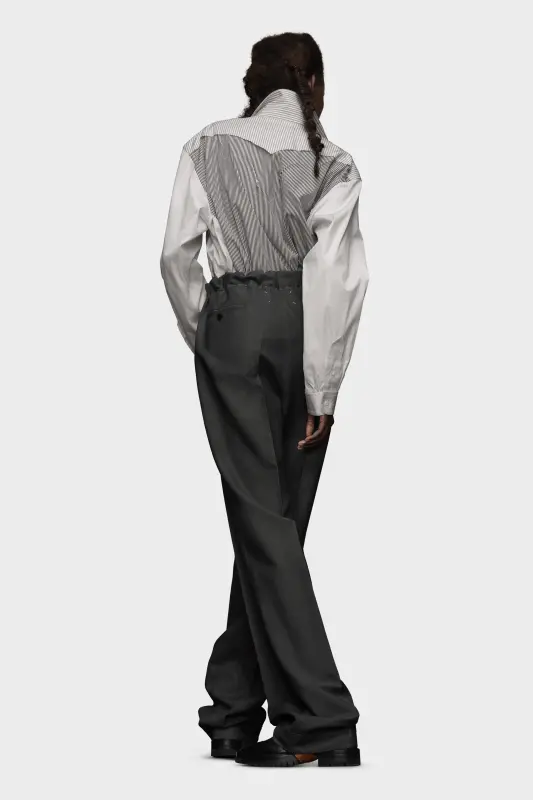 Made in wool mohair, the trousers showcase the Maison's Work-in-progress stitches around the waist. The casual drawstring is contrasted with smart pleats. They feature a hand-applied greasy patina technique for a lived-in look. Maison Margiela's signature, the Four stitches, appear at the back; the opposite of a label.