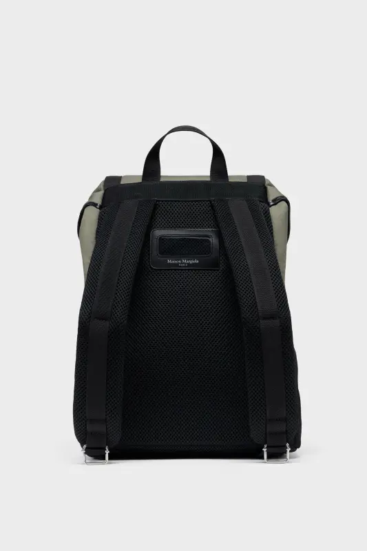 This technical backpack is designed with a structured flap top, dual front straps, and side mesh pockets for breathable utility. A drawstring fastening secures the main compartment, while padded shoulder straps enhance comfort. The Maison’s signature, the four stitches, appear at the front; the opposite of a label.